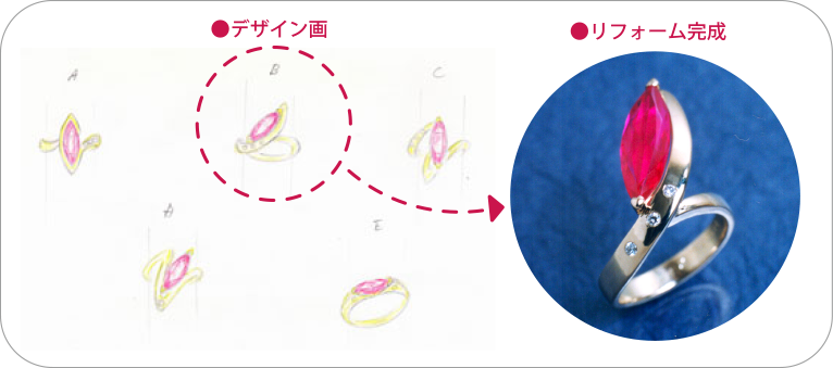 マインのリフォームは、まずお客様が宝石をリフォームされる目的や、ご希望、ご予算をお聞きします。そして、それに合わせたデザイン画を作成し、お見積もりをご提案します。その後、デザインを決め、加工に入ります。